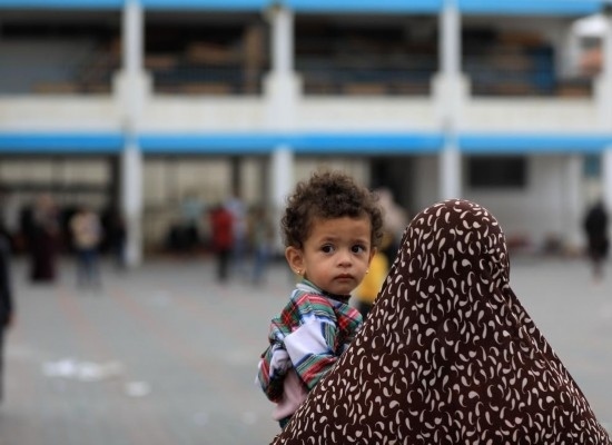10月9日,一名婦女抱著小孩在加沙地帶南部城市汗尤尼斯的一所學校躲避以色列空襲。新華社發(fā)(亞西爾·庫迪攝)