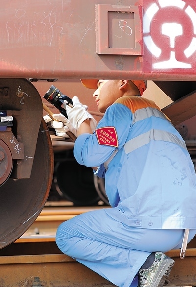 在鄭州北站,一名工人正對(duì)車(chē)底進(jìn)行檢修。本報(bào)記者 何嘉豪攝