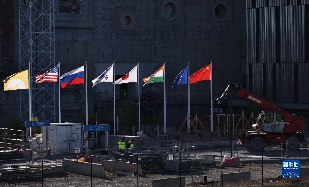 ?11月24日,在位于法國(guó)圣保羅-萊迪朗斯的國(guó)際熱核聚變實(shí)驗(yàn)反應(yīng)堆(ITER)的建造廠房外,中國(guó)、歐盟、印度、日本、韓國(guó)、俄羅斯、美國(guó)七個(gè)參與方的旗幟和ITER組織的旗幟迎風(fēng)飄揚(yáng)。新華社記者 高靜 攝