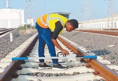 奧斯曼在亞吉鐵路的一座車站進(jìn)行巡檢。中國(guó)土木工程集團(tuán)吉布提有限公司供圖