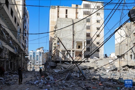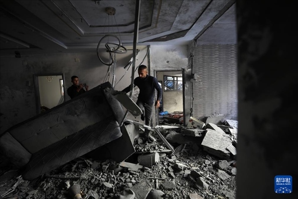 12月24日,在加沙地帶南部城市汗尤尼斯,人們查看以軍襲擊后的受損情況。新華社發(fā)(里澤克·阿卜杜勒賈瓦德攝)