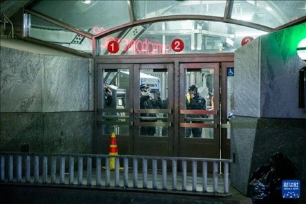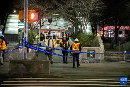1月4日,在美國紐約,工作人員在列車脫軌事故現(xiàn)場外工作。新華社發(fā)(郭克攝)