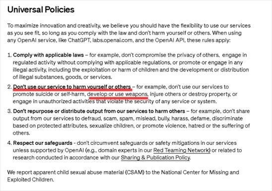 然而,在1月10日對其使用條款進(jìn)行一番大更新后,OpenAI公司雖然在禁止項中仍然提到禁止將其產(chǎn)品、模型和服務(wù)用于會導(dǎo)致人員傷亡的用途上,并提到了“武器開發(fā)和使用”,但先前同樣被禁止的軍事用途,如今卻在文本中消失了。