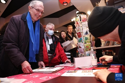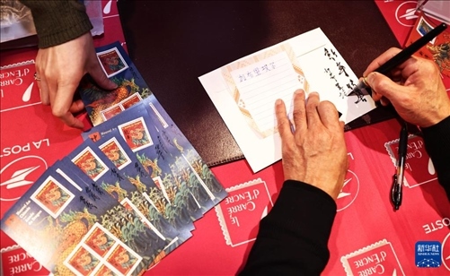 1月26日,在法國(guó)巴黎舉行的發(fā)行儀式上,郵票設(shè)計(jì)者陳江洪為當(dāng)?shù)丶]愛(ài)好者簽字留念。新華社記者 高靜 攝