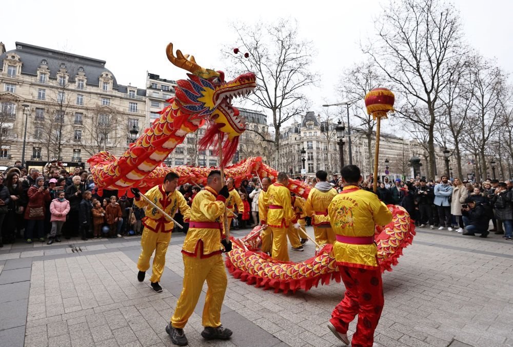 2月4日,人們在法國巴黎香榭麗舍大街觀看舞龍舞獅表演。新華社記者 高靜 攝