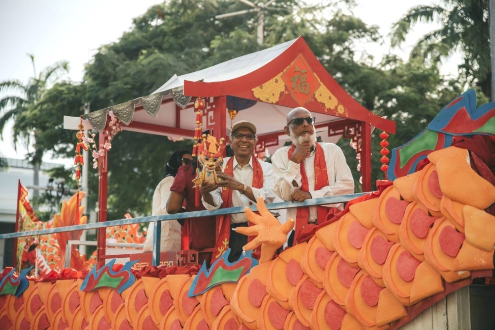 2月3日,在毛里求斯首都路易港,毛里求斯副總理胡斯努(左)參加花車巡游活動。新華社發(fā)(中國駐毛里求斯大使館供圖)