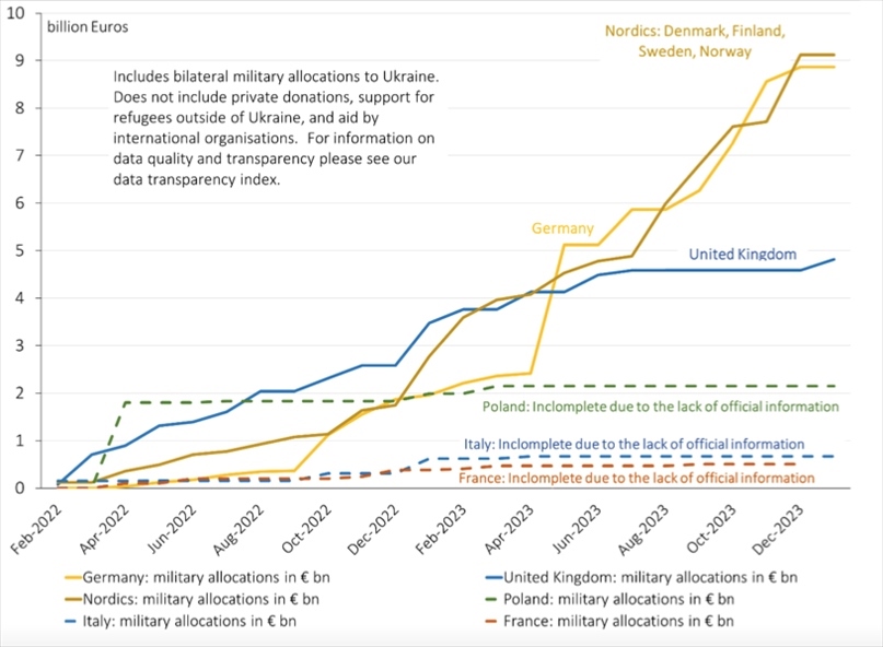 △歐洲國(guó)家對(duì)烏軍援圖表(圖片來(lái)源:基爾世界經(jīng)濟(jì)研究所)