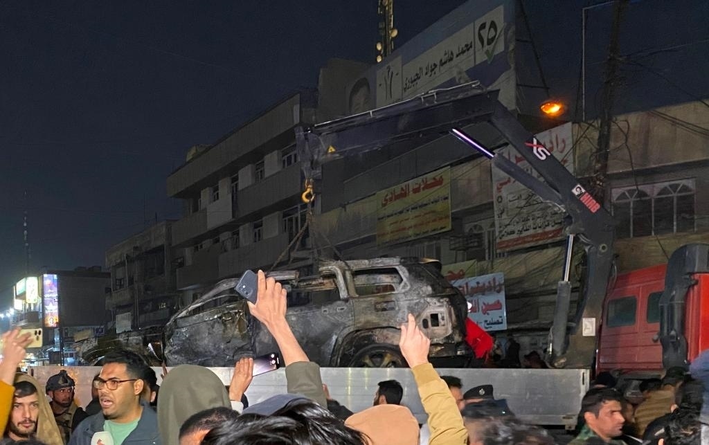 ?2024年2月7日,在伊拉克首都巴格達(dá),民防部門轉(zhuǎn)移遭無(wú)人機(jī)襲擊的車輛。新華社發(fā)(哈利勒·達(dá)伍德攝)