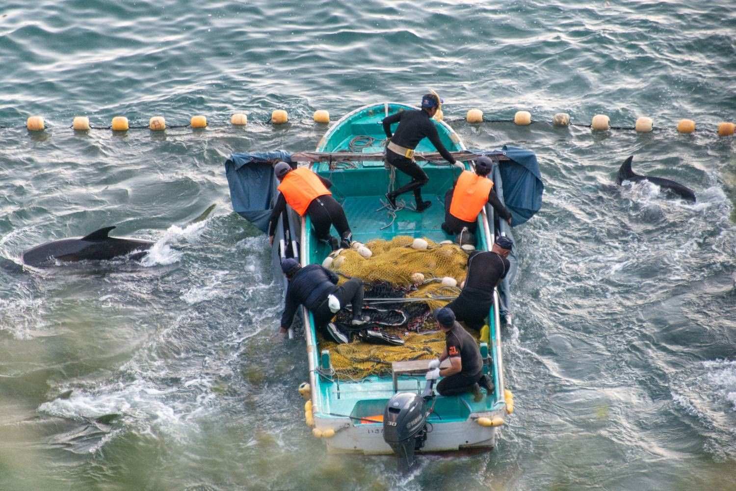 太地町又被稱為“海豚灣”,紀(jì)錄片《海豚灣》曾揭露該地屠殺海豚的血腥景象。每年9月到次年3月,捕鯨者們會(huì)聚集在太地町,捕殺海豚或其它小型鯨類。捕鯨者們將鋼桿放入海中,用錘子敲打,在水下形成聲墻,這些鋼柱兩端的金屬 "風(fēng)扇"會(huì)放大敲擊聲,使海豚迷失方向。隨后,捕鯨船會(huì)逼近海豚,將它們引入 "海灣",拉網(wǎng)誘捕,開啟“挑選海豚”的流程。作為肉類出售的海豚會(huì)被血腥屠殺。