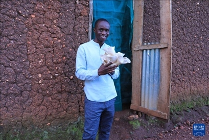 4月6日,在盧旺達(dá)南方省穆漢加市附近,尼揚(yáng)博·奧貝德在工坊展示培育的蘑菇。 新華社記者 董江輝 攝
