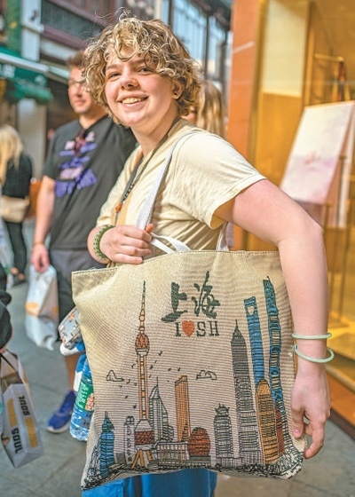 在上海豫園商城內(nèi),馬斯卡廷中學(xué)學(xué)生展示選購的商品。王 初攝(人民視覺)