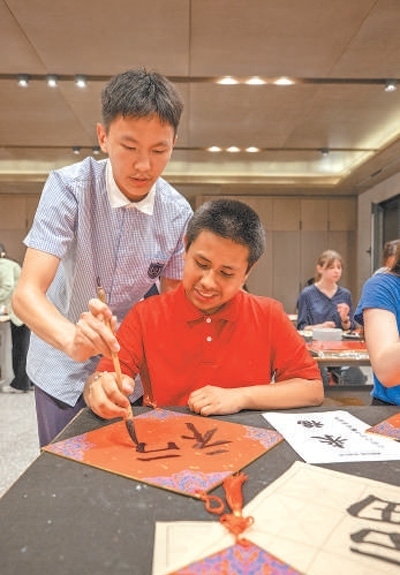 馬斯卡廷中學(xué)學(xué)生(前)在體驗(yàn)漢字書法。
