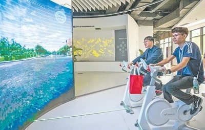 馬斯卡廷中學(xué)學(xué)生(右)體驗(yàn)VR單車雄安新區(qū)城市漫游項(xiàng)目。