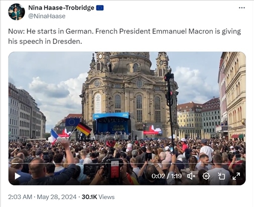 X平臺用戶@NinaHaase在28日凌晨2點03分發(fā)布的推文截圖,稱“現(xiàn)在,法國總統(tǒng)埃馬紐埃爾·馬克龍正在德累斯頓發(fā)表演講,他開場用了德語”,沒有提到法國軍隊。