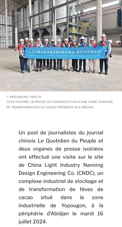 7月16日,人民日報(bào)與兩家科特迪瓦新聞機(jī)構(gòu)記者一行參觀了由中國輕工業(yè)南寧設(shè)計(jì)工程有限公司總承包的可可加工及可可豆倉庫建設(shè)項(xiàng)目,該項(xiàng)目坐落在阿比讓郊區(qū)的約普貢工業(yè)區(qū)。該公司負(fù)責(zé)人指出,該項(xiàng)目綜合體計(jì)劃于2024年年底完工,包括一個(gè)可加工5萬噸可可豆的工廠、可存儲(chǔ)14萬噸可可豆的倉庫以及培訓(xùn)中心、行政大樓等?!钥铺氐贤甙⒈茸尵W(wǎng)報(bào)道