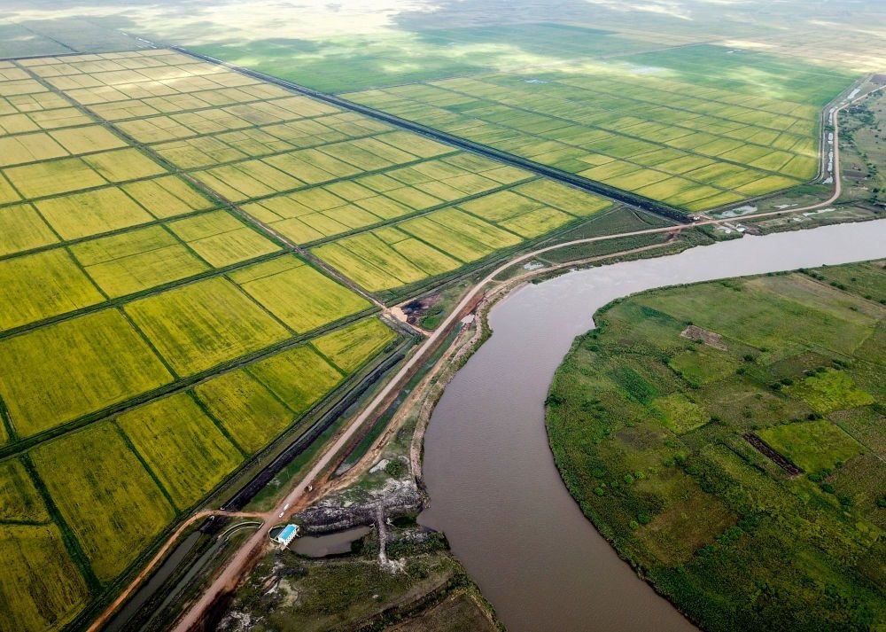 這是莫桑比克萬(wàn)寶莫桑農(nóng)業(yè)園的水稻田(2019年4月7日攝,無(wú)人機(jī)照片)。萬(wàn)寶莫桑農(nóng)業(yè)園是中非合作的大型水稻種植項(xiàng)目,極大地緩解了莫桑比克糧食短缺問(wèn)題。