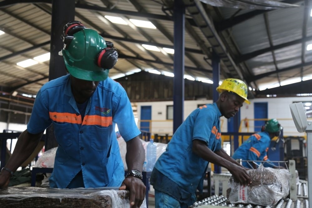 2024年6月10日,在科特迪瓦南部城鎮(zhèn)達(dá)布郊區(qū),工人們?cè)诿捞m橡膠加工廠(chǎng)對(duì)成品橡膠進(jìn)行打包。中國(guó)加工廠(chǎng)幫助科特迪瓦橡膠增加產(chǎn)品附加值,提高膠農(nóng)收入。