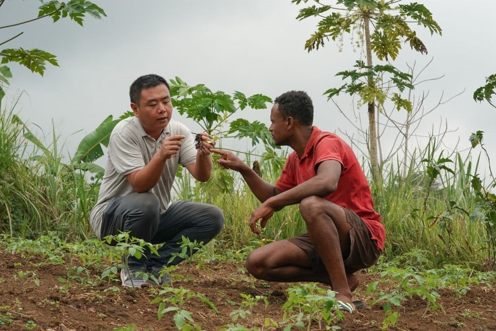 2023年7月15日,在圣多美和普林西比洛巴塔縣卡德拉斯村,中國(guó)援圣普農(nóng)牧業(yè)技術(shù)專(zhuān)家組專(zhuān)家許州達(dá)在田間指導(dǎo)農(nóng)戶(hù)努內(nèi)斯種植辣椒。中國(guó)援圣普農(nóng)牧業(yè)技術(shù)專(zhuān)家組與圣普農(nóng)業(yè)、漁業(yè)和農(nóng)村發(fā)展部合作,于2021年在圣普洛巴塔縣卡德拉斯村建立第一個(gè)中圣普農(nóng)業(yè)減貧示范村,并有效結(jié)合中國(guó)農(nóng)業(yè)技術(shù)和扶貧經(jīng)驗(yàn)幫助當(dāng)?shù)剞r(nóng)民增產(chǎn)增收。