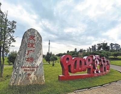 鐫刻著“友誼廣場”幾個中文大字的泰山石碑矗立在半山坡一片平地上。本報記者 任 彥攝