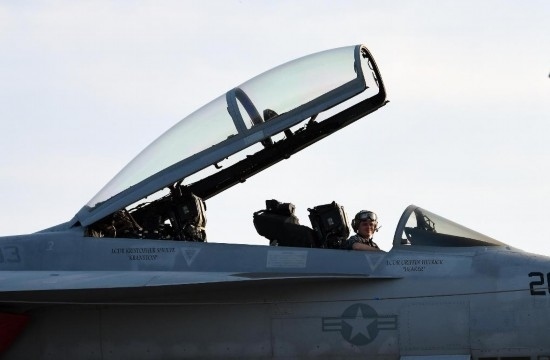 2017年7月22日,在美國(guó)弗吉尼亞州諾??撕\娀?,飛行員坐在“福特”號(hào)航母上的F/A-18戰(zhàn)斗機(jī)中。新華社記者殷博古攝