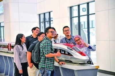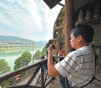 老撾《萬象時報》記者索薩坤·萬喬在參觀廣元千佛崖時,拍攝飛馳而過的動車組列車。老撾國家通訊社記者 汶娜萊·楠坎娜攝