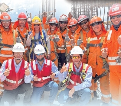 在中企承建的秘魯庫斯科圣安東尼奧國立大學升級改造項目施工現(xiàn)場,中秘兩國建設者合影。水 源攝