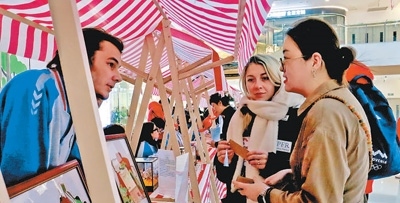 外國(guó)游客在北京延慶萬達(dá)廣場(chǎng)體驗(yàn)市集。
