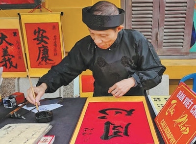 4月13日,在越南河內(nèi)胡志明故居,當(dāng)?shù)貢覟橹袊慰蜁鴮憽巴摹薄?/p>