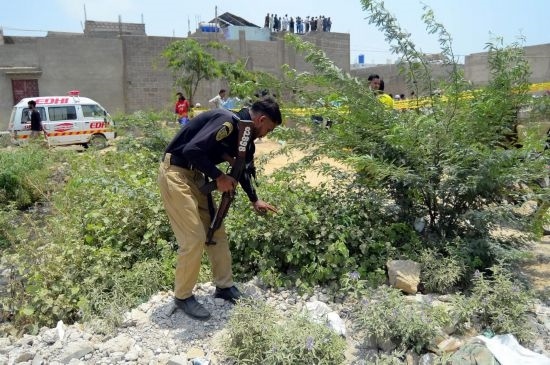 2025年5月8日,在巴基斯坦卡拉奇,安全人員檢查印度無人機襲擊現(xiàn)場附近區(qū)域。新華社發(fā)