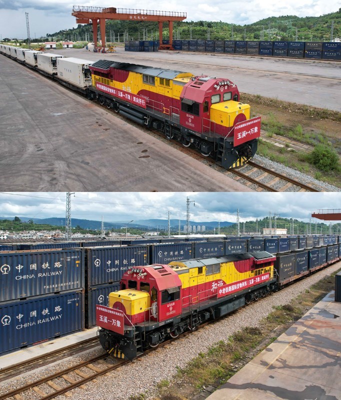 8月23日,準(zhǔn)備發(fā)車(chē)前往老撾萬(wàn)象的國(guó)際貨物列車(chē)停靠在中老鐵路玉溪研和站。