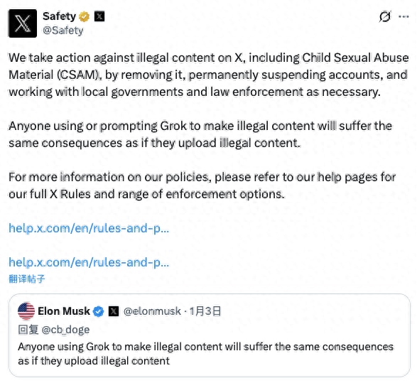 X表示,平臺會對非法內(nèi)容采取行動,包括刪除資料、封號,并在必要時與執(zhí)法機(jī)構(gòu)展開合作。馬斯克也在周末的一條帖子中強(qiáng)調(diào),任何使用“格羅克”制作非法內(nèi)容的人,將面臨與上傳非法內(nèi)容同樣的法律后果。