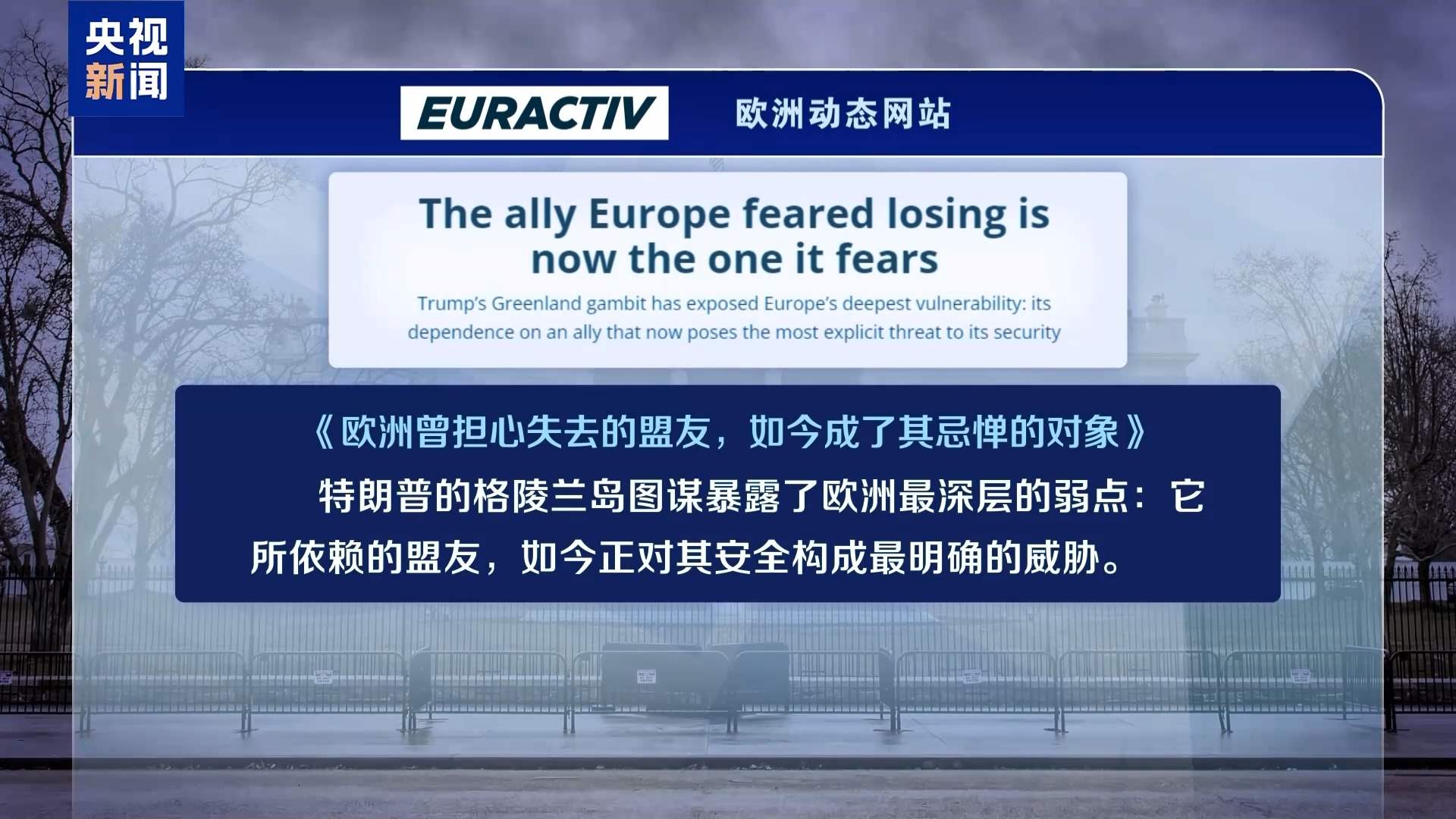 歐洲動(dòng)態(tài)網(wǎng)站6日以《歐洲曾擔(dān)心失去的盟友,如今成了其忌憚的對(duì)象》為題評(píng)論說(shuō),“特朗普的格陵蘭島圖謀暴露了歐洲最深層的弱點(diǎn):它所依賴(lài)的盟友,如今正對(duì)其安全構(gòu)成最明確的威脅。”文章還提醒說(shuō),我們正進(jìn)入一個(gè)“強(qiáng)權(quán)即公理”的新世界——而歐洲人對(duì)此毫無(wú)準(zhǔn)備?;蛟S,格陵蘭島可能帶來(lái)的羞辱,將促使歐洲人反思這一現(xiàn)狀,并最終采取行動(dòng)改變局面。