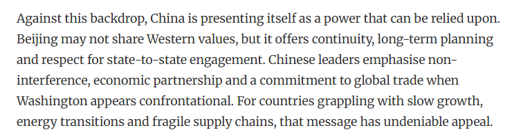 文章認為,在此背景下,中國是可靠力量。中國提供了連續(xù)性、長期規(guī)劃和尊重國家間的交流。中國強調不干涉、經(jīng)濟伙伴關系和對維護全球貿(mào)易。對于那些正面臨增長緩慢、能源轉型和供應鏈脆弱的國家來說,這一主張具有不可否認的吸引力。另外,中國與美國不同,中國并不要求合作時必須實現(xiàn)意識形態(tài)上的一致性。中國提供市場、投資和交流。在不確定的時代,這些反而更體現(xiàn)了一種穩(wěn)定。