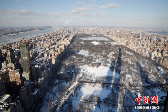 當(dāng)?shù)貢r間1月29日,從100層高樓俯瞰冰雪封凍的紐約市,中央公園白雪皚皚,遠(yuǎn)處的哈德遜河布滿浮冰。中新社記者 廖攀 攝