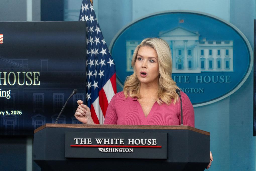 2月5日,在美國(guó)首都華盛頓,白宮新聞秘書(shū)萊維特出席記者會(huì)。新華社發(fā)(李源清攝)