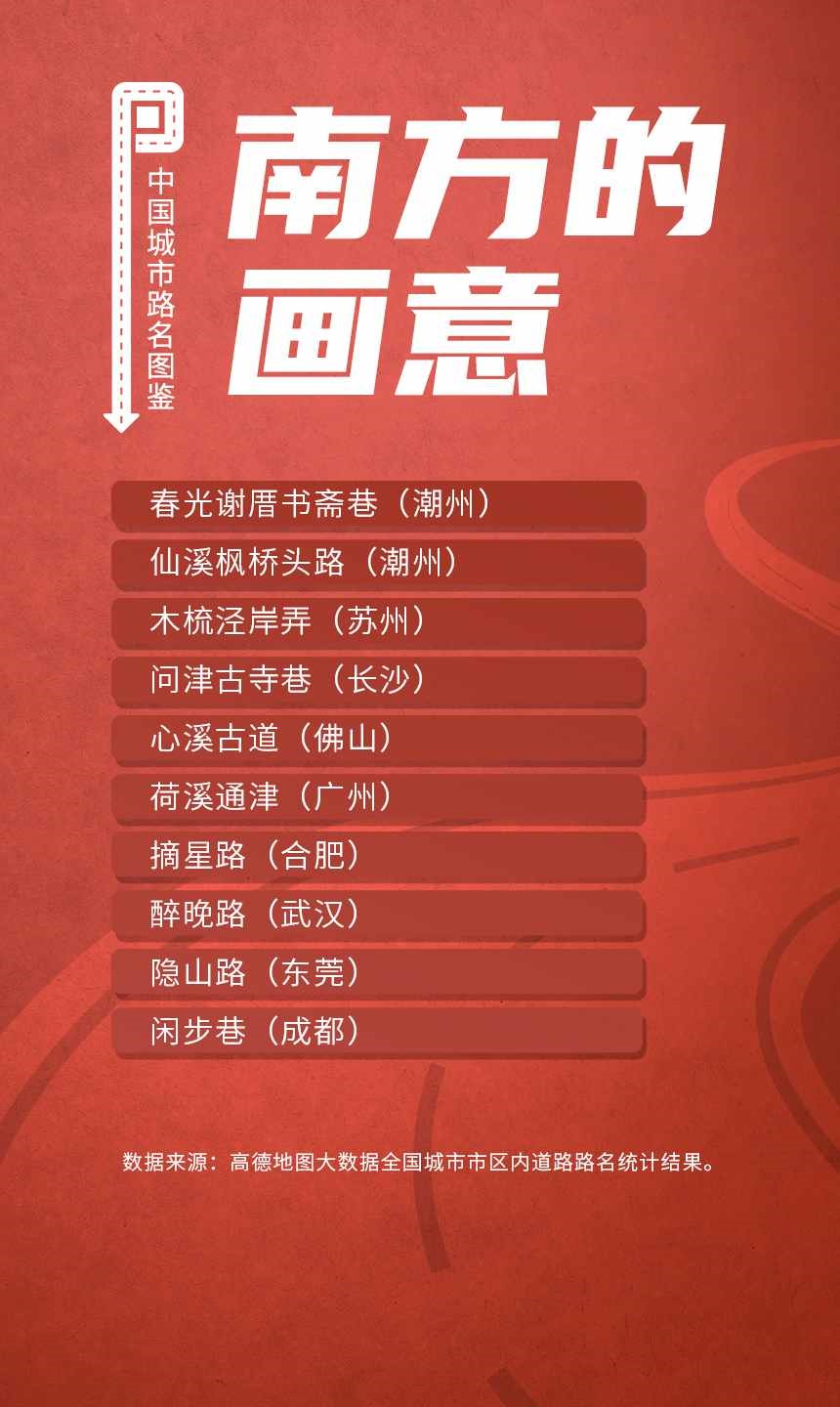 榜單顯示,人民路和建設(shè)路是全國(guó)重名率最高的道路,均有129個(gè)城市采用。此外,全國(guó)胡同最多的城市是北京;弄堂最多的城市是寧波;“小巷”最多的城市都在廣東省,深圳、東莞、中山、佛山和廣州包攬前五;“大道”最多的城市是佛山。