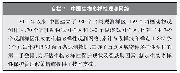 完善監(jiān)測觀測網(wǎng)絡。中國建立起各類生態(tài)系統(tǒng)、物種的監(jiān)測觀測網(wǎng)絡,在生物多樣性理論研究、技術(shù)示范與推廣以及物種與生境保護方面發(fā)揮了重要作用,為科研、教育、科普、生產(chǎn)等各領(lǐng)域提供了多樣化的信息服務與決策支持。其中,中國生態(tài)系統(tǒng)研究網(wǎng)絡(CERN)、國家陸地生態(tài)系統(tǒng)定位觀測研究網(wǎng)絡(CTERN)涵蓋所有生態(tài)系統(tǒng)和要素,中國生物多樣性監(jiān)測與研究網(wǎng)絡(Sino BON)覆蓋動物、植物、微生物等多種生物類群,中國生物多樣性觀測網(wǎng)絡(China BON)構(gòu)建了覆蓋全國的指示物種類群觀測樣區(qū)。
