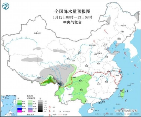 全國降水量預(yù)報(bào)圖(1月12日8時(shí)-13日8時(shí))