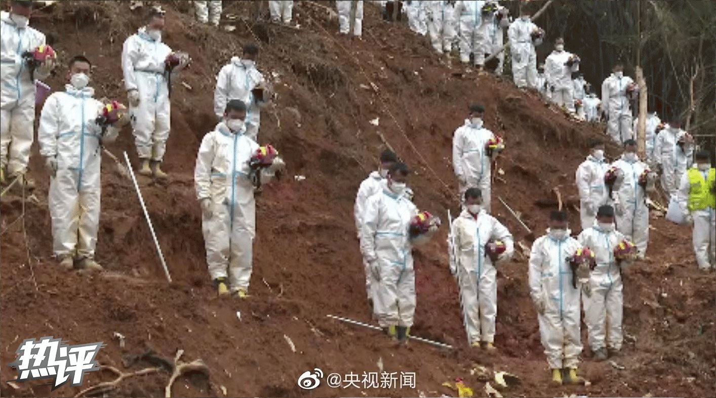 3月27日下午,“3·21”東航MU5735航空器飛行事故遇難者集體哀悼活動(dòng)在事發(fā)地搜救現(xiàn)場(chǎng)舉行。全場(chǎng)鳴笛,國(guó)家應(yīng)急處置指揮部全體人員、事故現(xiàn)場(chǎng)搜救人員等面向遇難飛機(jī)方向肅穆而立,默哀三分鐘,以此寄托對(duì)遇難者的哀思。