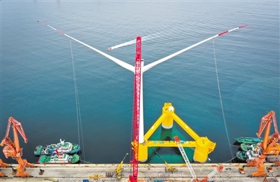 由中國船舶集團海裝風電股份有限公司牽頭,聯(lián)合相關(guān)單位自主研制的“扶搖號”浮式風電機組浮體平臺上配備6.2兆瓦抗臺型I類風力發(fā)電機組,在深遠海應(yīng)用場將依靠九個對稱分布的懸錨鏈系泊實現(xiàn)固定。圖為完成總裝的國內(nèi)首臺深遠海浮式風電裝備“扶搖號”在茂名廣港碼頭靜待拖航(無人機照片)。記者劉大偉攝
