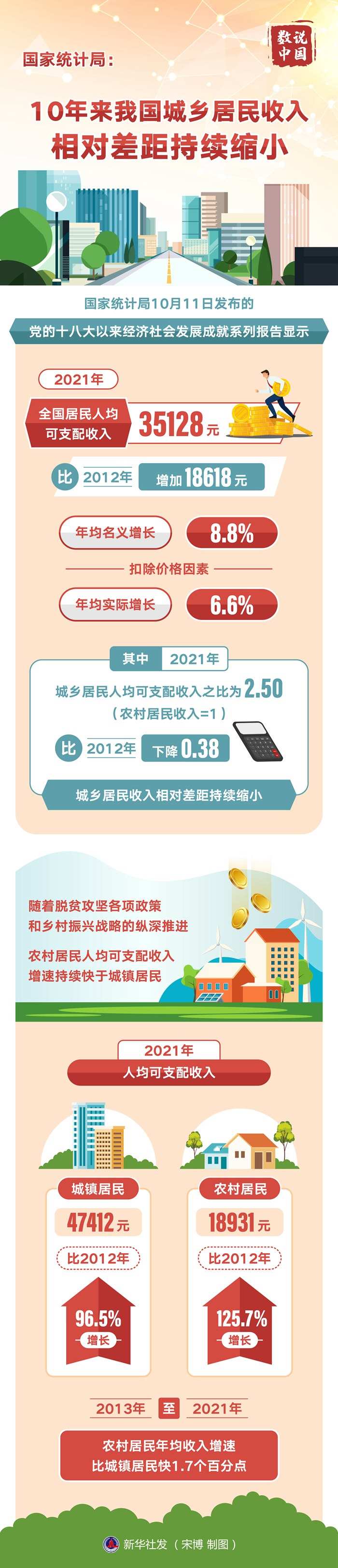 新華社北京10月11日電(記者魏玉坤、嚴(yán)賦憬)國家統(tǒng)計(jì)局11日發(fā)布的黨的十八大以來經(jīng)濟(jì)社會(huì)發(fā)展成就系列報(bào)告顯示,2021年全國居民人均可支配收入35128元,比2012年增加18618元,年均名義增長8.8%,扣除價(jià)格因素,年均實(shí)際增長6.6%。其中,2021年城鄉(xiāng)居民人均可支配收入之比為2.50(農(nóng)村居民收入=1),比2012年下降0.38,城鄉(xiāng)居民收入相對(duì)差距持續(xù)縮小。