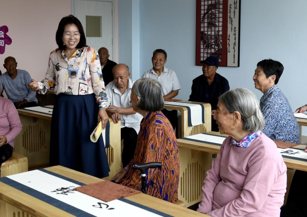 2022年9月6日,在山東省濱州市沾化區(qū)康教醫(yī)養(yǎng)綜合服務(wù)中心國(guó)學(xué)堂,院長(zhǎng)高子美在為老人講解疫情防控知識(shí)。新華社記者范長(zhǎng)國(guó)攝