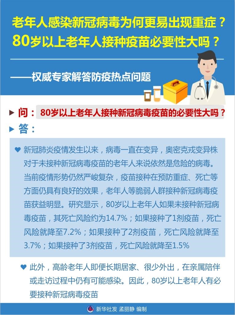 此外,高齡老年人即便長期居家、很少外出,在親屬陪伴或走訪過程中仍有可能感染。因此,80歲以上老年人有必要接種新冠病毒疫苗。