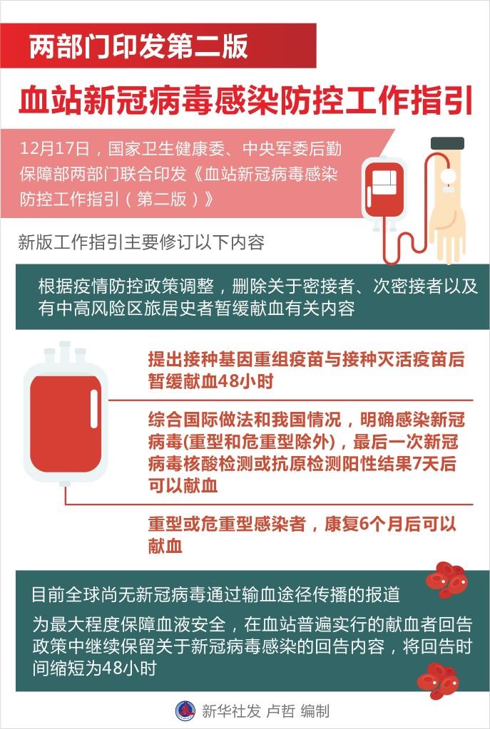 與2021年《血站新冠肺炎疫情常態(tài)化防控工作指引》相比,新版工作指引主要修訂以下內(nèi)容:根據(jù)疫情防控政策調(diào)整,新版工作指引刪除關(guān)于密接者、次密接者以及有中高風險區(qū)旅居史者暫緩獻血有關(guān)內(nèi)容。提出接種基因重組疫苗與接種滅活疫苗后暫緩獻血48小時。綜合國際做法和我國情況,明確感染新冠病毒(重型和危重型除外),最后一次新冠病毒核酸檢測或抗原檢測陽性結(jié)果7天后可以獻血;重型或危重型感染者,康復(fù)6個月后可以獻血。