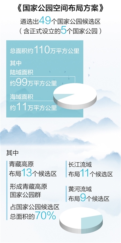 在空間布局上,遴選出49個(gè)國(guó)家公園候選區(qū)(含正式設(shè)立的5個(gè)國(guó)家公園),總面積約110萬(wàn)平方公里,其中陸域面積約99萬(wàn)平方公里、海域面積約11萬(wàn)平方公里,占陸域國(guó)土面積的10.3%。充分銜接國(guó)家重大戰(zhàn)略和重大生態(tài)工程,其中,青藏高原布局13個(gè)候選區(qū),形成青藏高原國(guó)家公園群,占國(guó)家公園候選區(qū)總面積的70%;長(zhǎng)江流域布局11個(gè)候選區(qū),黃河流域布局9個(gè)候選區(qū)。全部建成后,中國(guó)國(guó)家公園保護(hù)面積的總規(guī)模將居世界第一。
