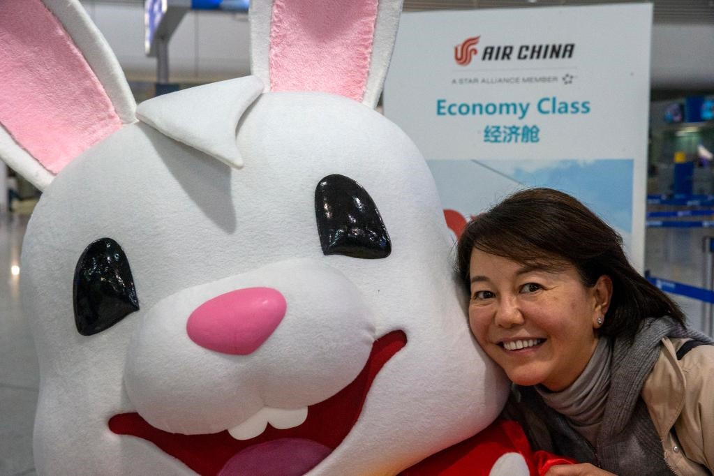 1月26日,在希臘雅典國(guó)際機(jī)場(chǎng),一名準(zhǔn)備搭乘航班前往中國(guó)的乘客與裝扮成兔子造型的工作人員合影。(新華社發(fā),馬里奧斯·羅洛斯攝)