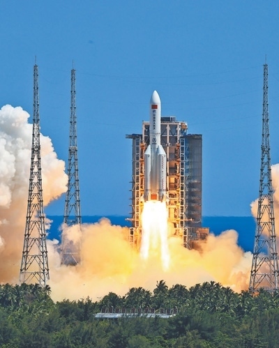 搭載問天實(shí)驗(yàn)艙的長(zhǎng)征五號(hào)B遙三運(yùn)載火箭,在海南文昌航天發(fā)射場(chǎng)點(diǎn)火發(fā)射。 新華社記者 李 剛攝