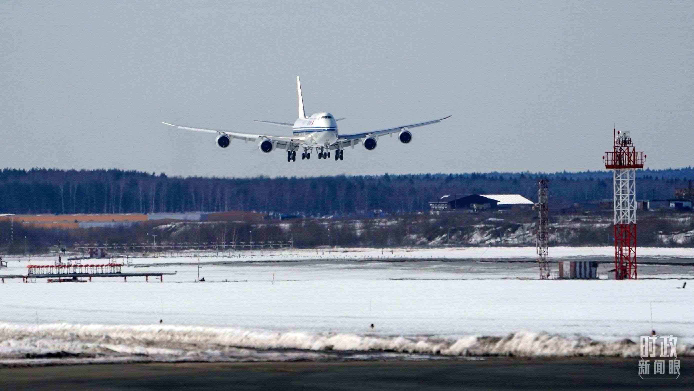 △習(xí)近平主席乘坐的專(zhuān)機(jī)即將落地莫斯科。(總臺(tái)國(guó)廣記者李晉拍攝)