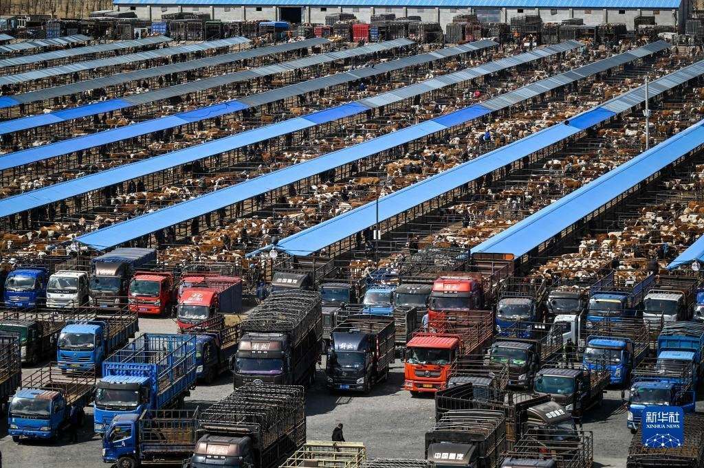 4月12日,內(nèi)蒙古通遼市科爾沁左翼中旗舍伯吐鎮(zhèn)成峰牲畜交易市場里一片繁忙景象,1000余輛貨運車整齊排列,1萬余頭黃牛正等待被交易。據(jù)介紹,這個交易市場年交易80萬頭肉牛,交易額可達80億元。今年以來,當(dāng)?shù)嘏J行星橹饾u轉(zhuǎn)好,來自遼寧、吉林、山東等地的買家再次聚集于此,帶動了養(yǎng)殖戶增收。新華社記者 連振 攝