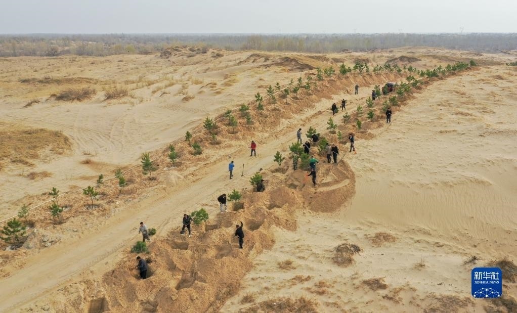 4月15日,在內(nèi)蒙古通遼市科爾沁左翼后旗,治沙工人在科爾沁沙地植樹造林。